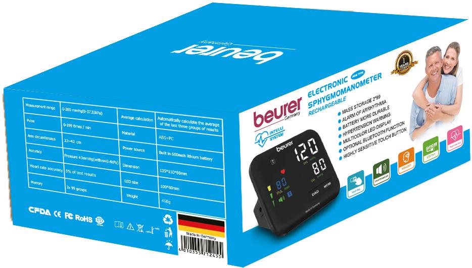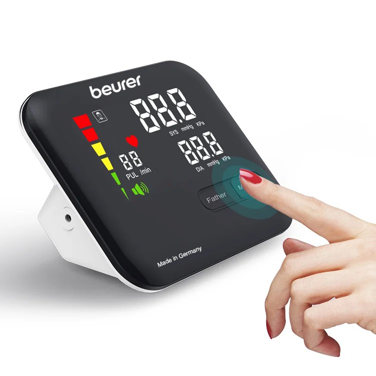 فشار سنج بازویی سخنگو بیورر مدل BM102 به راحتی و به سرعت فشار خون را اندازه گیری نموده و در صورت وضعیت خطرناک، نشانگرهای آن هشدار می دهند. همچنین قابلیت اندازه گیری ضربان قلب و هشدار در صورت بی نظمی را نیز دارد. این فشار سنج دارای خروجی صوتی به زبان فارسی می باشد.